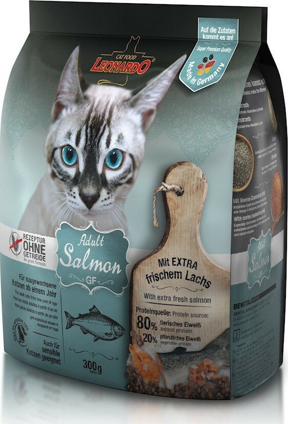 Πλούσια σε σολομό, η ξηρά τροφή Leonardo για ενήλικες γάτες προσφέρει ισορροπημένη διατροφή και ενέργεια, χωρίς σιτηρά, μειώνοντας δυσανεξίες και αλλεργίες.