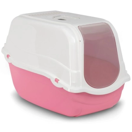 Κλειστή τουαλέτα γάτας σε ροζ απόχρωση με καπάκι και φίλτρο οσμών για καθαρότερο περιβάλλον και λιγότερες διαρροές άμμου. Ιδανική για διακριτική χρήση στο σπίτι.